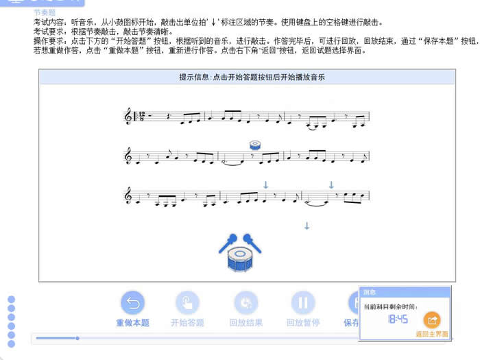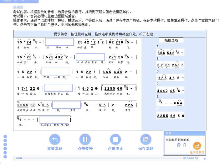 ★ 試聽音樂,將右側(cè)選項(xiàng)區(qū)內(nèi)合適的音符拖拽到樂譜空白處,以考查考生的識(shí)譜能力。