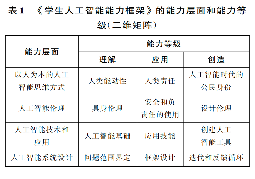 4)人工智能系統(tǒng)設(shè)計(jì),包括確定人工智能系統(tǒng)的問題范圍、框架構(gòu)建、訓(xùn)練、測試和優(yōu)化的綜合工程技能。該框架的第二個維度涉及理解、應(yīng)用和創(chuàng)造三個能力等級,旨在反映學(xué)生在四個能力層面的掌握水平。
