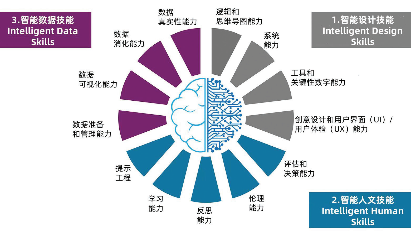 人類與人工智能之間強大的協(xié)同是世界快速發(fā)展的關(guān)鍵,而高校在塑造人工智能融合的未來方面發(fā)揮著舉足輕重的作用。這就要求進行靈活、創(chuàng)新和高瞻遠矚的教育改革,超越傳統(tǒng),培養(yǎng)能夠熟練運用人工智能推動社會進步的積極主動的領(lǐng)導(dǎo)者。這項改革的關(guān)鍵是培養(yǎng)三種能力——智能人文技能、智能數(shù)據(jù)技能和智能設(shè)計技能,并將其完美地融入課程和實踐中。這些能力對于培養(yǎng)學(xué)生的倫理素養(yǎng)、批判性思維和解決問題的能力至關(guān)重要,使學(xué)生有能力成為敏捷的創(chuàng)造者。