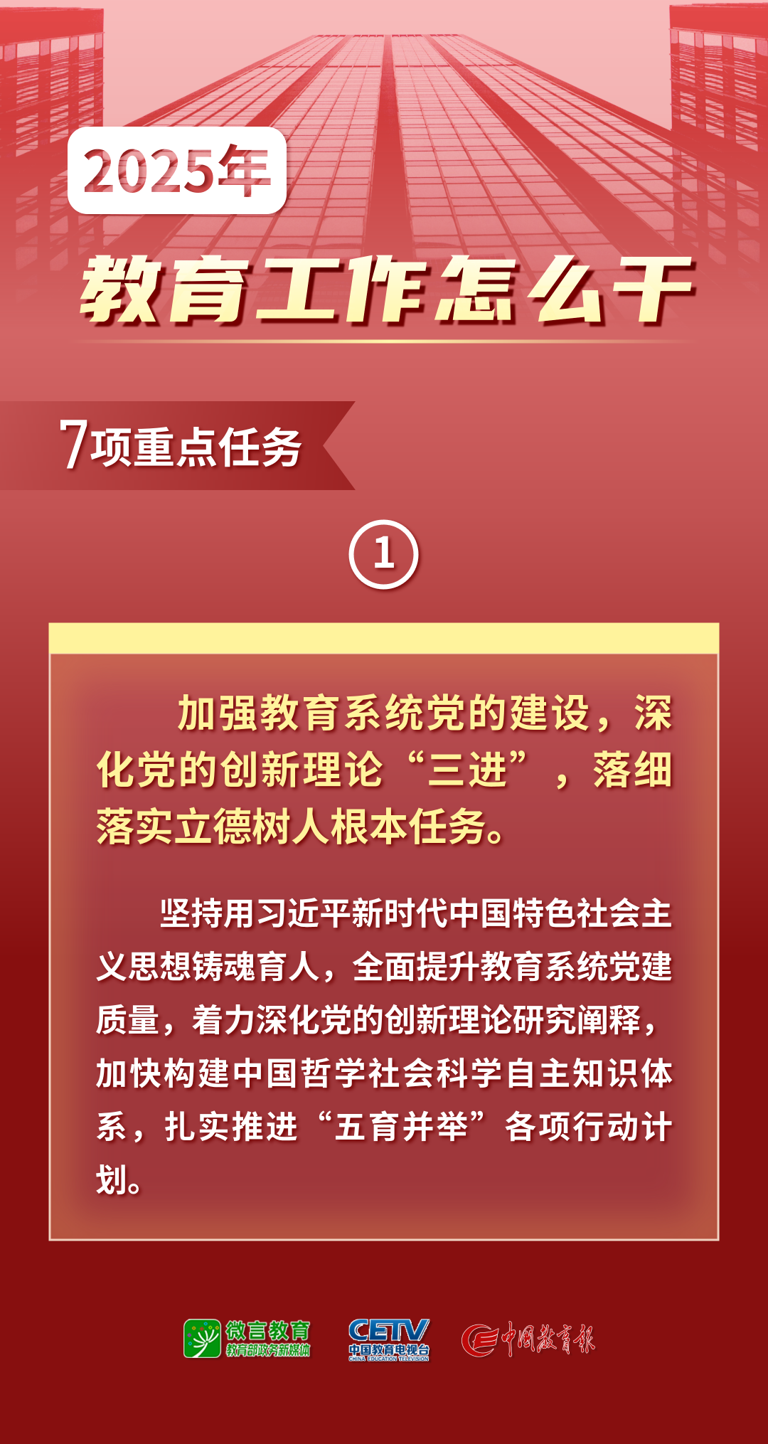 會議指出,2025年是貫徹全國教育大會精神、落實教育強國建設(shè)規(guī)劃綱要的關(guān)鍵之年,也是“十四五”收官和“十五五”謀劃之年,更是面向十年建成教育強國全面布局、高位推進之年。要突出抓好全年工作重點,推動教育強國建設(shè)高起點布局、高質(zhì)量推進。一要加強教育系統(tǒng)黨的建設(shè),深化黨的創(chuàng)新理論“三進”,落細落實立德樹人根本任務(wù)。堅持用習(xí)近平新時代中國特色社會主義思想鑄魂育人,全面提升教育系統(tǒng)黨建質(zhì)量,著力深化黨的創(chuàng)新理論研究闡釋,加快構(gòu)建中國哲學(xué)社會科學(xué)自主知識體系,扎實推進“五育并舉”各項行動計劃。二要錨定國家重大戰(zhàn)略急需,深入推動教育科技人才良性循環(huán)。優(yōu)化高等教育布局,加快建立科技發(fā)展、國家戰(zhàn)略需求牽引的學(xué)科專業(yè)設(shè)置調(diào)整機制,積極探索形成科技創(chuàng)新與產(chǎn)業(yè)創(chuàng)新深度融合的制度機制,著力構(gòu)建現(xiàn)代職業(yè)教育體系,助力新質(zhì)生產(chǎn)力發(fā)展。三要堅持以人民為中心發(fā)展教育,持續(xù)提升教育公共服務(wù)質(zhì)量和水平。健全與人口變化相適應(yīng)的基礎(chǔ)教育資源統(tǒng)籌調(diào)配機制,把縣中振興作為深化基礎(chǔ)教育擴優(yōu)提質(zhì)的關(guān)鍵樞紐點,有序探索中考改革,統(tǒng)籌提升校內(nèi)教育質(zhì)量和校外治理水平,保障好特殊群體。四要啟動實施教育家精神鑄魂強師行動,引領(lǐng)新時代高水平教師隊伍建設(shè)。加強師德師風(fēng)建設(shè),健全教師教育培養(yǎng)培訓(xùn)體系,超前謀劃教師資源配置。五要健全教育國際戰(zhàn)略合作體系,推動各級各類教育找準國際交流合作的方位和職責(zé),提升全球教育治理能力,促進更高水平教育對外開放。六要持續(xù)推進國家教育數(shù)字化戰(zhàn)略,助力教育教學(xué)深層次變革。強化制度建設(shè),全面提升數(shù)字化領(lǐng)導(dǎo)力,始終堅持“應(yīng)用為王”,加強前瞻布局,持續(xù)擴大數(shù)字教育國際影響力。七要深入踐行大安全觀,持續(xù)鞏固教育系統(tǒng)安全穩(wěn)定態(tài)勢。牢牢掌握黨對學(xué)校意識形態(tài)工作領(lǐng)導(dǎo)權(quán),織密扎牢校園安全“防護網(wǎng)”,完善工作機制。