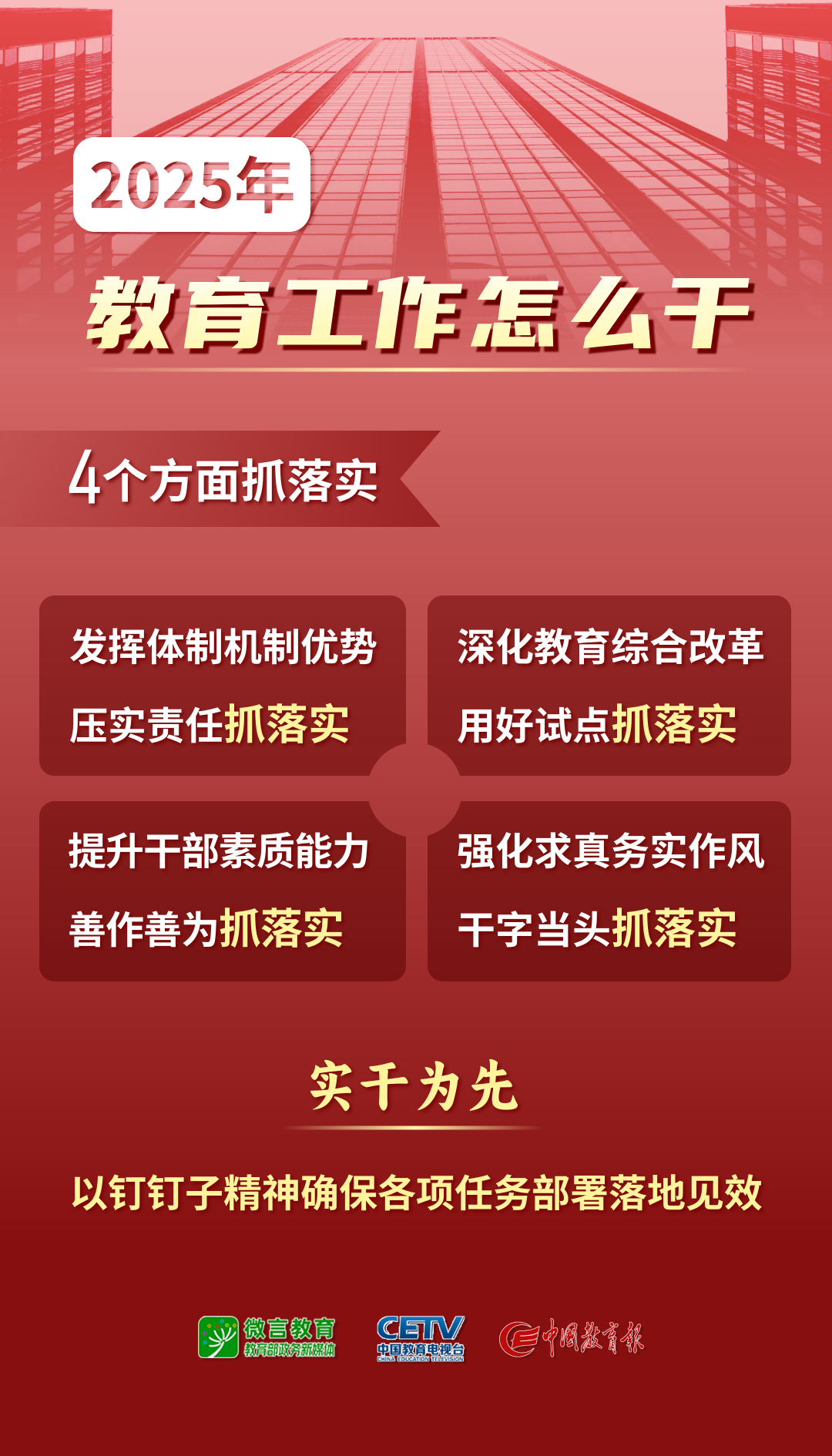 會議要求,要圍繞實干為先,做有理想、負責(zé)任的行動主義者,把黨中央謀定的強國目標(biāo)、任務(wù)落到行動和實效上。要發(fā)揮體制機制優(yōu)勢、壓實責(zé)任抓落實,深化教育綜合改革、用好試點抓落實,提升干部素質(zhì)能力、善作善為抓落實,強化求真務(wù)實作風(fēng)、干字當(dāng)頭抓落實,以釘釘子精神確保各項任務(wù)部署落地見效。要建立常態(tài)化長效化的黨紀學(xué)習(xí)教育機制,使紀律教育貫穿干部成長全周期、融入組織管理全過程,使紀律成為抓落實的有力保障。