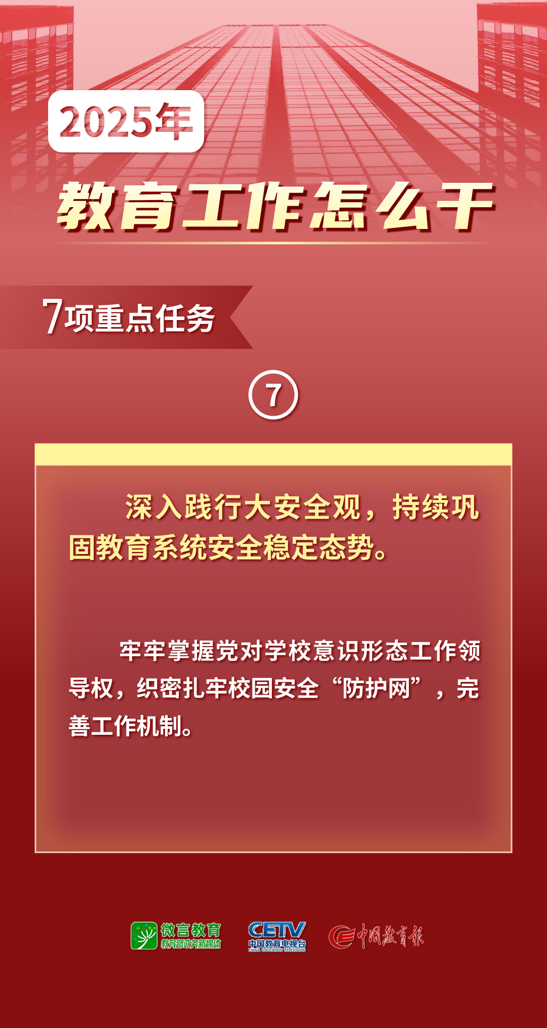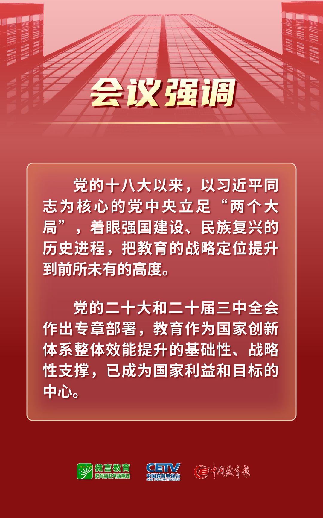 會議強調(diào),黨的十八大以來,以習(xí)近平同志為核心的黨中央立足“兩個大局”,著眼強國建設(shè)、民族復(fù)興的歷史進程,把教育的戰(zhàn)略定位提升到前所未有的高度。黨的二十大和二十屆三中全會作出專章部署,教育作為國家創(chuàng)新體系整體效能提升的基礎(chǔ)性、戰(zhàn)略性支撐,已成為國家利益和目標(biāo)的中心。站在新的起點上,教育強國建設(shè)進入蓄勢突破、全面躍升的關(guān)鍵階段。要準確把握教育面臨環(huán)境的深刻變化,增強以教育強國支撐引領(lǐng)中國式現(xiàn)代化的使命感,充分認識國際形勢復(fù)雜多變的新趨勢、我國經(jīng)濟社會發(fā)展的新特征、制約教育高質(zhì)量發(fā)展的新問題、教育高水平安全的新挑戰(zhàn),保持定力、積極作為,把習(xí)近平總書記關(guān)于教育的重要論述有效轉(zhuǎn)化為工作思路和方法舉措,統(tǒng)籌好守正與創(chuàng)新,堅定不移走中國特色社會主義教育發(fā)展道路;統(tǒng)籌好綜合改革與試點推進,不斷提高支撐引領(lǐng)中國式現(xiàn)代化能力水平;統(tǒng)籌好重點開局與久久為功,推動教育強國建設(shè)積厚成勢、行穩(wěn)致遠;統(tǒng)籌好高質(zhì)量發(fā)展與高水平安全,確保教育系統(tǒng)成為安全可靠可信之地。