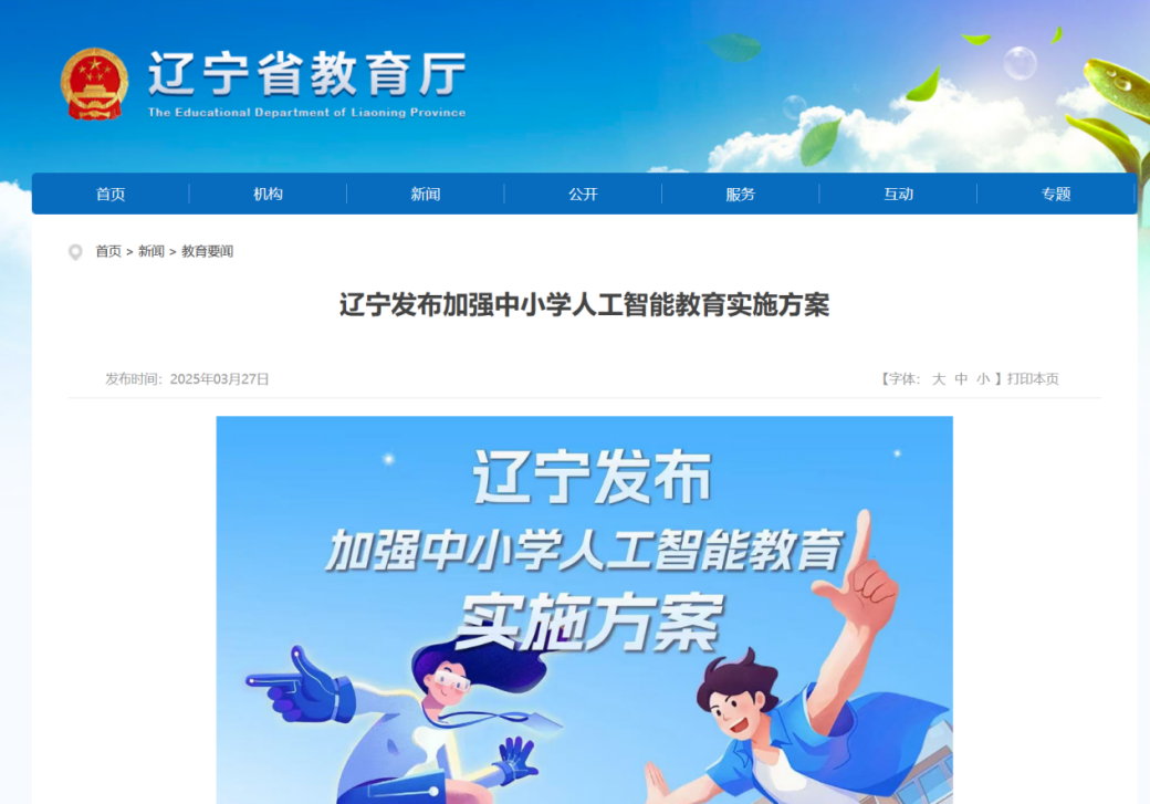 2025年3月27日,遼寧省教育廳印發(fā)《加強中小學(xué)人工智能教育實施方案》?!斗桨浮肪劢拐n程、教學(xué)、師資、資源、評價等關(guān)鍵環(huán)節(jié),培養(yǎng)學(xué)生科學(xué)興趣、科學(xué)精神和實踐能力。圍繞人工智能教育全鏈條布局七大重點任務(wù):一是強化人工智能課程體系建設(shè);二是深化人工智能教育教學(xué)改革;三是推動人工智能賦能教師能力提升;四是加強人工智能應(yīng)用場景建設(shè);五是加快人工智能教育基地建設(shè);六是推進人工智能教育資源共建共享;七是開展人工智能特色活動。遼寧省提出以下工作要求:到2027年,建成30個以上中小學(xué)人工智能教育基地,形成可復(fù)制、可推廣的典型案例;到2030年,在中小學(xué)?;酒占叭斯ぶ悄芙逃嫣嵘龑W(xué)生人工智能應(yīng)用技能和素養(yǎng),為培養(yǎng)創(chuàng)新型人才奠定基礎(chǔ)。