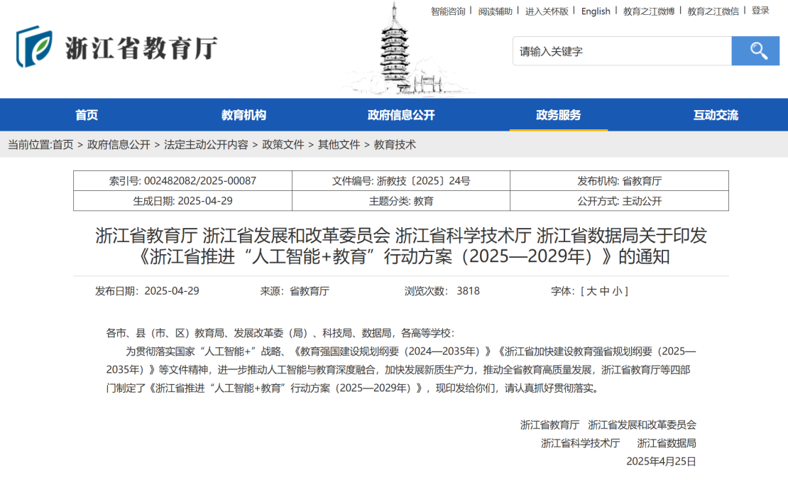 2025年4月25日,浙江省教育廳印發(fā)《浙江省推進“人工智能+教育”行動方案(2025—2029年)》。方案明確五項重點任務(wù)——升級“人工智能+教育”基礎(chǔ)環(huán)境;建設(shè)人工智能教育重點應(yīng)用場景;建設(shè)人工智能教育重點應(yīng)用場景;提升教師人工智能素養(yǎng);深化人工智能教育實踐研究與國際交流,并提出如下工作要求:2025年,打造一批高質(zhì)量的人工智能教育實驗基地和典型應(yīng)用場景,形成可推廣的實踐經(jīng)驗;到2027年,統(tǒng)籌建立統(tǒng)一的算力調(diào)度管理機制,構(gòu)建高標(biāo)準(zhǔn)、高質(zhì)量的人工智能課程體系和評價體系,助力實現(xiàn)教育資源優(yōu)化配置和個性化學(xué)習(xí)路徑;到2029年,實現(xiàn)人工智能教育基礎(chǔ)設(shè)施的基本覆蓋,各級各類學(xué)校廣泛普及人工智能教育,形成人工智能教育應(yīng)用生態(tài),助力教育的系統(tǒng)性變革。浙江省將進一步深化人工智能在教育領(lǐng)域的創(chuàng)新應(yīng)用,充分利用人工智能優(yōu)勢,變革人才培養(yǎng)模式、創(chuàng)新教育教學(xué)方式和提升教育治理能力,加快發(fā)展新質(zhì)生產(chǎn)力,推動全省教育高質(zhì)量發(fā)展。
