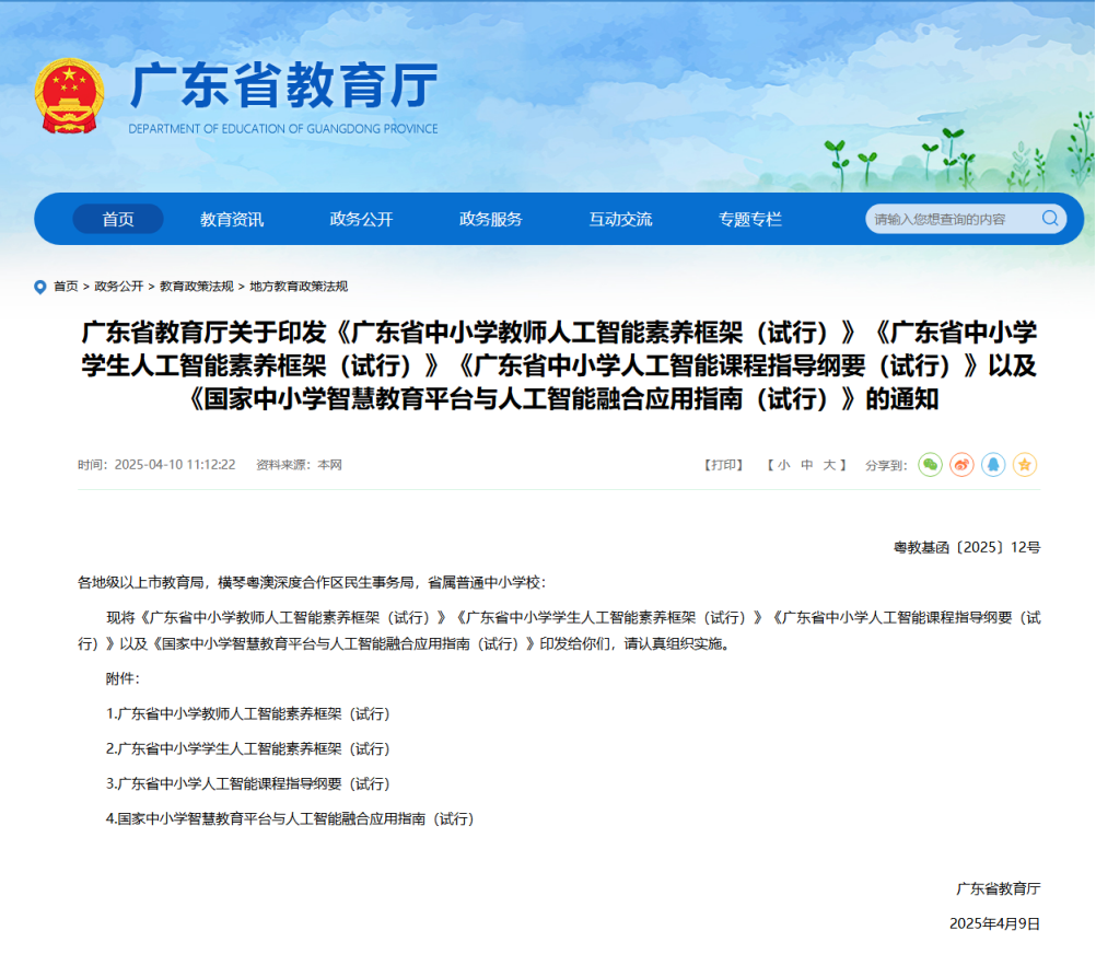 2025年4月9日,廣東省教育廳印發(fā)《廣東省中小學(xué)教師人工智能素養(yǎng)框架(試行)》《廣東省中小學(xué)學(xué)生人工智能素養(yǎng)框架(試行)》《廣東省中小學(xué)人工智能課程指導(dǎo)綱要(試行)》以及《國家中小學(xué)智慧教育平臺與人工智能融合應(yīng)用指南(試行)》,推出中小學(xué)人工智能教育“211”落地架構(gòu),打出一套人工智能教育課程設(shè)置、資源開發(fā)、師資建設(shè)、素養(yǎng)提升、育人賦能的組合拳。