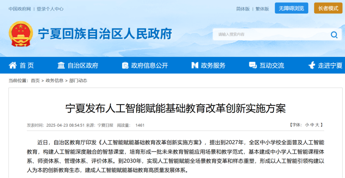 2025年4月,寧夏回族自治區(qū)教育廳印發(fā)《人工智能賦能基礎(chǔ)教育改革創(chuàng)新實施方案》,提出到2027年,全區(qū)中小學(xué)校全面普及人工智能教育,構(gòu)建人工智能深度融合的智慧課堂,培育形成一批未來教育智能應(yīng)用場景和教學(xué)范式,基本建成中小學(xué)人工智能課程體系、師資體系、管理體系、評價體系。到2030年,實現(xiàn)人工智能賦能全場景教育變革和樣態(tài)重塑,形成以人工智能引領(lǐng)構(gòu)建以人為本的創(chuàng)新教育生態(tài),建成人工智能賦能基礎(chǔ)教育高質(zhì)量發(fā)展體系。