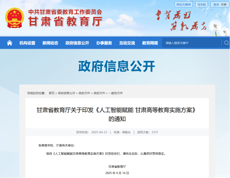 2025年4月16日,甘肅省教育廳印發(fā)《人工智能賦能甘肅高等教育實施方案》?!斗桨浮分赋觯瑢⑻嵘龜?shù)智化管理服務(wù)效能;創(chuàng)新人才培養(yǎng)體系;深化人工智能助教助學(xué)改革;提升全員數(shù)字素養(yǎng)與技能;優(yōu)化人工智能科技創(chuàng)新體系;深化數(shù)智賦能開放共享。以國家教育數(shù)字化戰(zhàn)略行動為引領(lǐng),推動人工智能與高等教育深度融合,構(gòu)建現(xiàn)代化高等教育體系,加快甘肅高等教育高質(zhì)量發(fā)展。