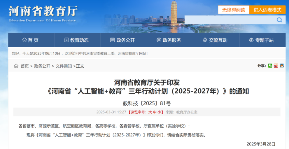 2025年3月28日,河南省教育廳印發(fā)《河南省“人工智能 + 教育” 三年行動計劃(2025—2027 年)》。 計劃指出,要推動人工智能與教學(xué)深度融合;探索人工智能賦能學(xué)科專業(yè)建設(shè);完善人工智能人才培養(yǎng)體系;探索人工智能賦能教育治理;夯實智能教育新基建;開展“人工智能+教育”規(guī)模試點?!队媱潯芬笸茝V人工智能教學(xué)全場景應(yīng)用,探索AI情景式教學(xué),營造身臨其境的學(xué)習(xí)體驗,創(chuàng)設(shè)模擬仿真實驗空間和實踐環(huán)境,有效支撐教師實驗實踐教學(xué)。遴選推廣一批省級“人工智能+高等教育”應(yīng)用場景典型案例。
