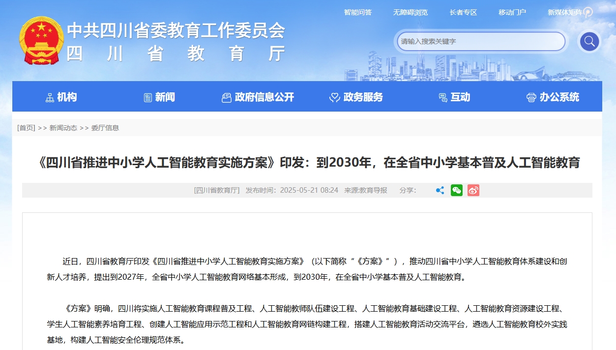 2025年5月,四川省教育廳印發(fā)《四川省推進中小學(xué)人工智能教育實施方案》,推動四川省中小學(xué)人工智能教育體系建設(shè)和創(chuàng)新人才培養(yǎng),提出到2027年,全省中小學(xué)人工智能教育網(wǎng)絡(luò)基本形成,到2030年,在全省中小學(xué)基本普及人工智能教育。