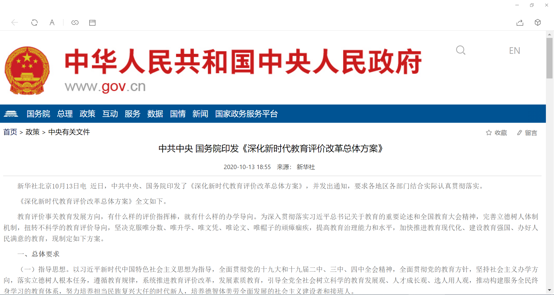 2.完善政府履行教育職責(zé)評(píng)價(jià)。對(duì)省級(jí)政府主要考核全面貫徹黨的教育方針和黨中央關(guān)于教育工作的決策部署、落實(shí)教育優(yōu)先發(fā)展戰(zhàn)略、解決人民群眾普遍關(guān)心的教育突出問(wèn)題等情況,既評(píng)估最終結(jié)果,也考核努力程度及進(jìn)步發(fā)展。各地根據(jù)國(guó)家層面確立的評(píng)價(jià)內(nèi)容和指標(biāo),結(jié)合實(shí)際進(jìn)行細(xì)化,作為對(duì)下一級(jí)政府履行教育職責(zé)評(píng)價(jià)的依據(jù)。