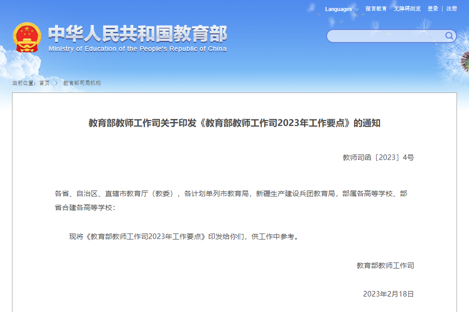 2023年是全面貫徹落實(shí)黨的二十大精神的開局之年。教師工作總體要求是:以習(xí)近平新時代中國特色社會主義思想為指導(dǎo),緊緊圍繞深入學(xué)習(xí)貫徹黨的二十大精神這條主線,認(rèn)真貫徹落實(shí)習(xí)近平總書記關(guān)于教育的重要論述特別是關(guān)于教師隊(duì)伍建設(shè)的重要指示批示精神,深刻領(lǐng)悟“兩個確立”的決定性意義,增強(qiáng)“四個意識”、堅定“四個自信”、做到“兩個維護(hù)”,全面貫徹黨的教育方針,落實(shí)立德樹人根本任務(wù),深刻學(xué)習(xí)領(lǐng)會教育、科技、人才一體化部署要求,將教師作為教育發(fā)展的第一資源,加強(qiáng)師德師風(fēng)建設(shè),培養(yǎng)高素質(zhì)教師隊(duì)伍,弘揚(yáng)尊師重教社會風(fēng)尚,全面深化新時代教師隊(duì)伍建設(shè)改革,以高質(zhì)量教師隊(duì)伍支撐高質(zhì)量教育體系建設(shè),為推進(jìn)教育現(xiàn)代化、建設(shè)教育強(qiáng)國、辦好人民滿意的教育提供有力的人力資源保障。