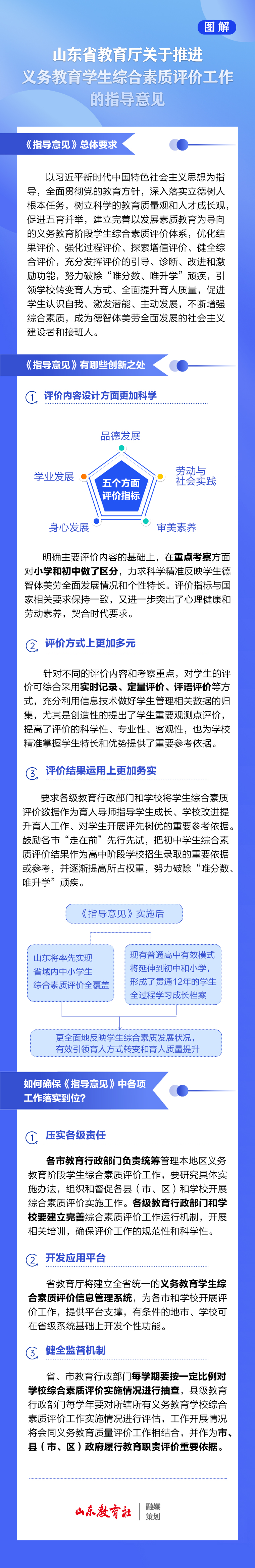 答:一是壓實各級責(zé)任。各市教育行政部門負(fù)責(zé)統(tǒng)籌管理本地區(qū)義務(wù)教育階段學(xué)生綜合素質(zhì)評價工作,要研究具體實施辦法,組織和督促各縣(市、區(qū))和學(xué)校開展綜合素質(zhì)評價實施工作。各級教育行政部門和學(xué)校要建立完善綜合素質(zhì)評價工作運(yùn)行機(jī)制,開展相關(guān)培訓(xùn),確保評價工作的規(guī)范性和科學(xué)性。二是開發(fā)應(yīng)用平臺。省教育廳將建立全省統(tǒng)一的義務(wù)教育學(xué)生綜合素質(zhì)評價信息管理系統(tǒng),為各市和學(xué)校開展評價工作,提供平臺支撐,有條件的地市、學(xué)??稍谑〖壪到y(tǒng)基礎(chǔ)上開發(fā)個性功能。三是健全監(jiān)督機(jī)制。省、市教育行政部門每學(xué)期要按一定比例對學(xué)校綜合素質(zhì)評價實施情況進(jìn)行抽查,縣級教育行政部門每學(xué)年要對所轄所有義務(wù)教育學(xué)校綜合素質(zhì)評價工作實施情況進(jìn)行評估,工作開展情況將會同義務(wù)教育質(zhì)量評價工作相結(jié)合,并作為市、縣(市、區(qū))政府履行教育職責(zé)評價重要依據(jù)。