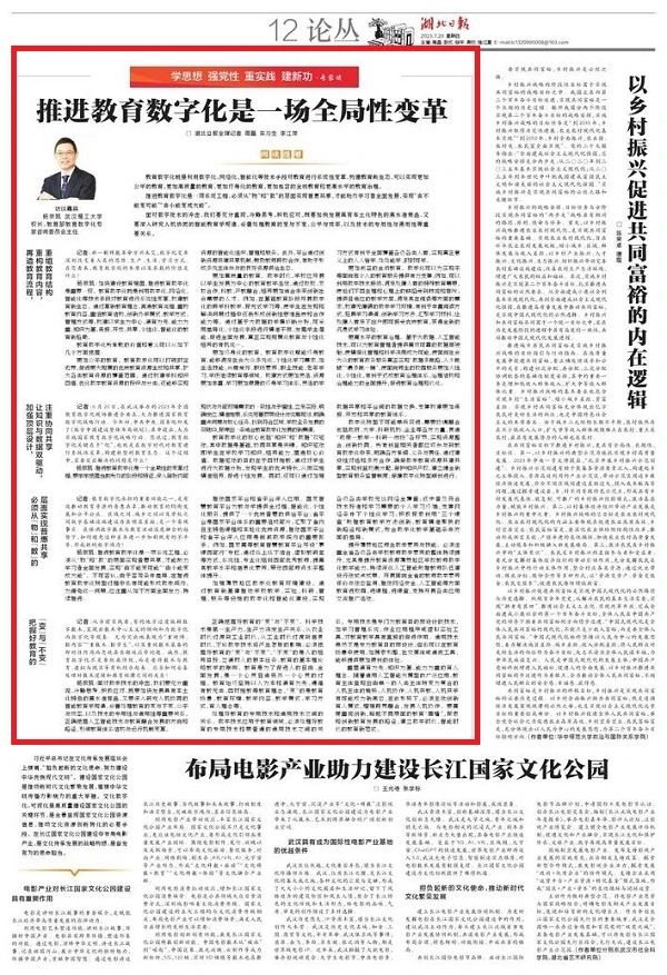 近日,湖北日報以《推進教育數(shù)字化是一場全局性變革》為題,專題訪談了武漢理工大學(xué)校長、教育部教育數(shù)字化專家咨詢委員會主任楊宗凱。全文如下: