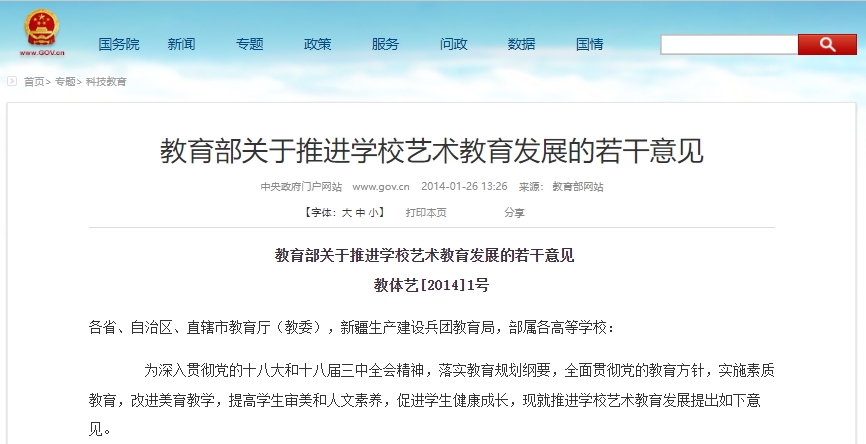 自2014年起,一系列關(guān)于藝術(shù)教育的政策出臺(tái),指導(dǎo)各級(jí)教育主管單位、學(xué)校藝術(shù)教育工作的開(kāi)展,培養(yǎng)學(xué)生藝術(shù)修養(yǎng)和審美情趣,實(shí)現(xiàn)以美育人、以美化人、以美潤(rùn)心、以美培元,促進(jìn)學(xué)生全面發(fā)展。