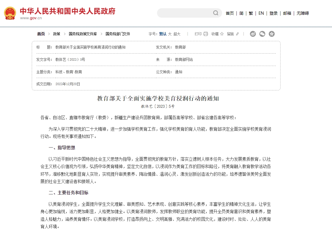 2023年,教育部印發(fā)《關(guān)于全面實(shí)施學(xué)校美育浸潤(rùn)行動(dòng)的通知》,明確深化美育評(píng)價(jià)改革,發(fā)揮評(píng)價(jià)的牽引和導(dǎo)向作用,完善初高中藝術(shù)科目學(xué)業(yè)水平考試,將美育評(píng)價(jià)納入學(xué)生綜合素質(zhì)檔案。一起來(lái)回顧近幾年出臺(tái)的美育相關(guān)政策與措施: