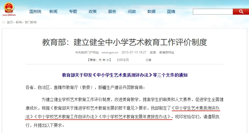 2015年,相繼印發(fā)了《中小學(xué)生藝術(shù)素質(zhì)測(cè)評(píng)辦法》、《中小學(xué)校藝術(shù)教育工作自評(píng)辦法》、《中小學(xué)學(xué)校藝術(shù)教育發(fā)展年度報(bào)告辦法》三個(gè)文件。