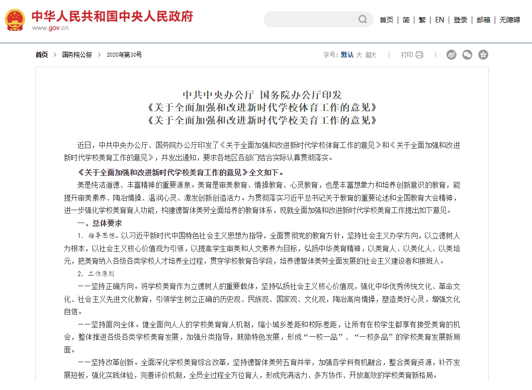 2020年,國(guó)務(wù)院辦公廳印發(fā)《關(guān)于全面加強(qiáng)和改進(jìn)學(xué)校美育工作的意見(jiàn)》中指出要全面實(shí)施中小學(xué)藝術(shù)素質(zhì)測(cè)評(píng),將測(cè)評(píng)結(jié)果納入初、高中學(xué)生綜合素質(zhì)評(píng)價(jià)。探索將藝術(shù)類(lèi)科目納入中考改革試點(diǎn),納入高中階段學(xué)校考試招生錄取計(jì)分科目。