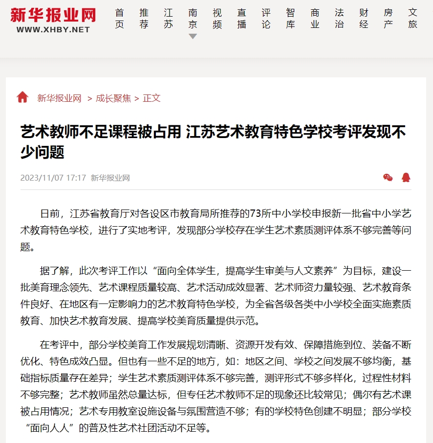 各地市在探索藝術(shù)考試、推動(dòng)藝術(shù)中考實(shí)施等工作上取得一定成效,但在推動(dòng)過(guò)程中也發(fā)現(xiàn)一些問(wèn)題。例如2023年,江蘇省教育廳實(shí)地考評(píng)了新一批申報(bào)省中小學(xué)藝術(shù)教育特色的73所學(xué)校,發(fā)現(xiàn)部分學(xué)校存在學(xué)生藝術(shù)素質(zhì)測(cè)評(píng)體系不夠完善、測(cè)評(píng)形式不夠多樣化、過(guò)程性材料不夠完整等問(wèn)題。