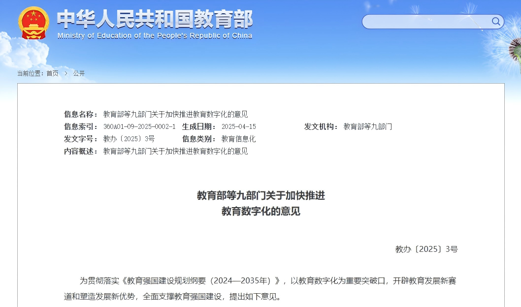 2025年4月教育部等九部門印發(fā)《關(guān)于加快推進(jìn)教育數(shù)字化的意見(jiàn)》,意見(jiàn)中指出要推動(dòng)課程、教材、教育數(shù)字化改革,賦能教育評(píng)價(jià)改革,建立基于大數(shù)據(jù)和人工智能支持的教育評(píng)價(jià)機(jī)制,完善結(jié)果評(píng)價(jià),開(kāi)展多維度的過(guò)程評(píng)價(jià)、增值評(píng)價(jià)和綜合評(píng)價(jià)。