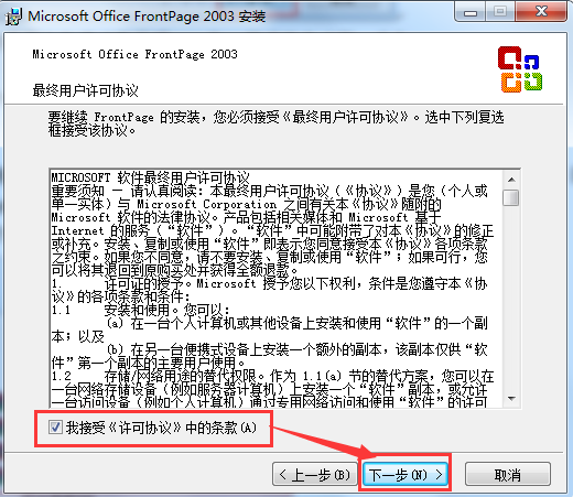⑦在彈出的界面上勾選“我接受……”,然后單擊“下一步”